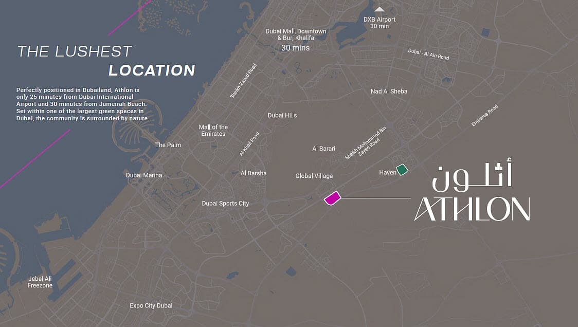 Athlon by Aldar enjoys a prime location in Dubailand, combining the serenity of a green lifestyle with seamless access to Dubai’s major landmarks. The community is well-connected by key road networks, ensuring smooth commutes to the city’s leisure, retail, and business hubs. Residents benefit from being close to schools, healthcare, and family-friendly attractions, while enjoying a peaceful retreat surrounded by nature.