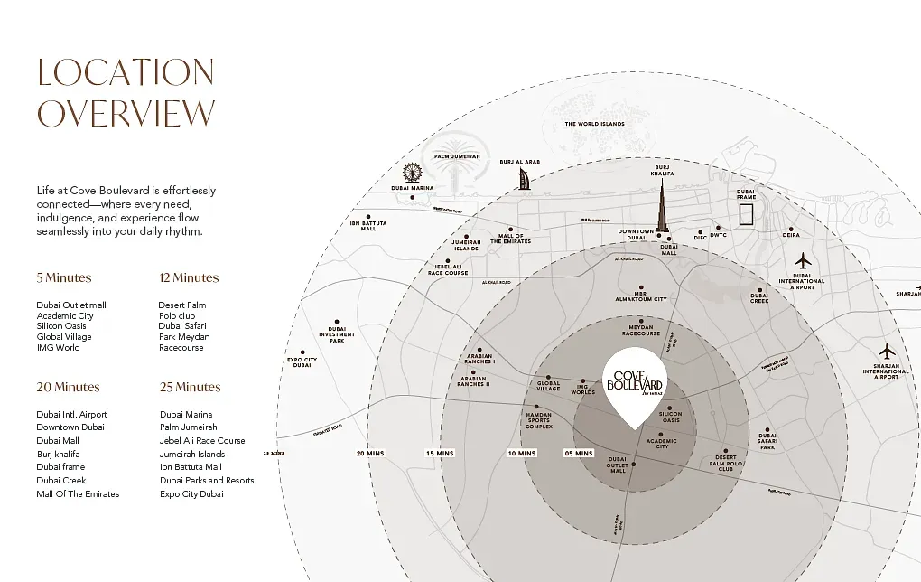 Cove Boulevard enjoys a strategic location at Dubailand Residence Complex (DLRC), offering both tranquility and excellent connectivity. With quick access to Dubai-Al Ain Road, Emirates Road, and Sheikh Mohammed Bin Zayed Road, residents can easily reach prime business, leisure, and educational hubs across Dubai. From family amenities to lifestyle attractions, everything you need is within minutes.