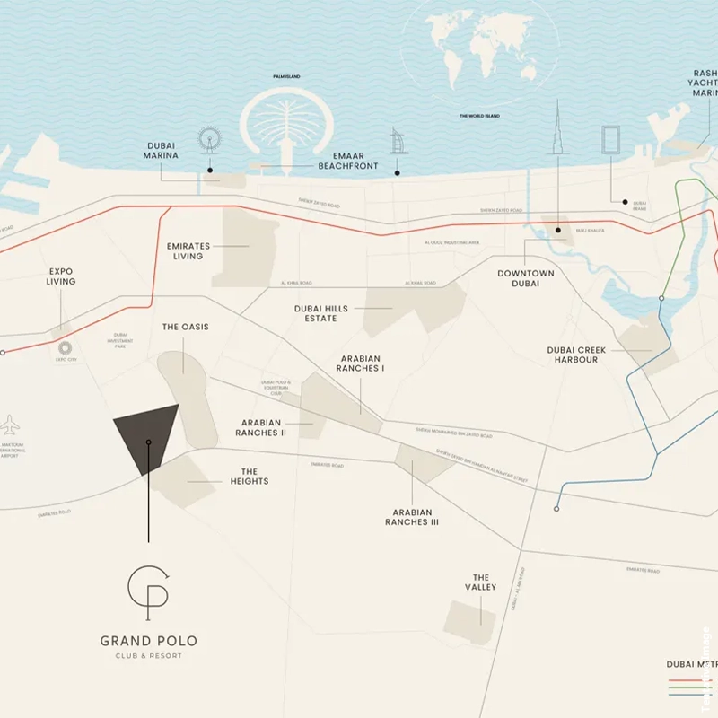Emaar Chevalia Estate 2 is perfectly located at the Grand Polo Club & Resort, combining peaceful suburban living with excellent connectivity. Residents enjoy proximity to major roads and cultural hubs, including Downtown Dubai, Expo City, and Al Maktoum International Airport, while being surrounded by lush greenery, polo fields, and landscaped gardens. This blend of convenience and serenity makes it one of Dubai’s most sought-after villa communities.