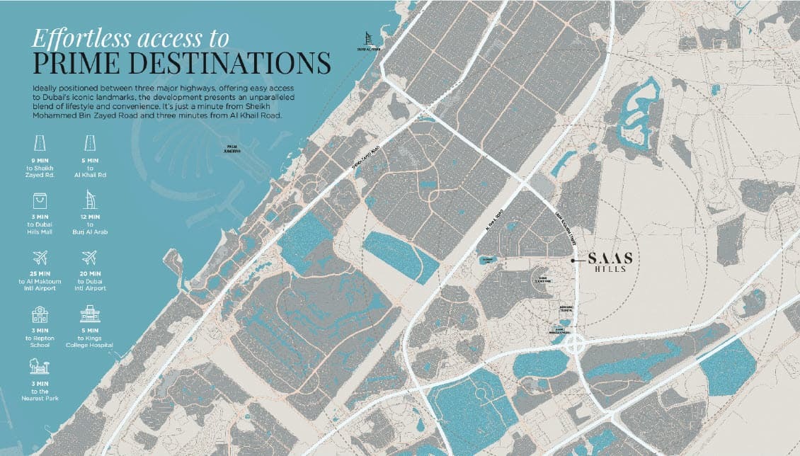 SAAS Hills at Dubai Science Park enjoys a prime location with excellent connectivity to Dubai’s most popular destinations. Its position ensures smooth access to key highways and business districts, while leisure hubs, shopping malls, and entertainment venues are all within a short drive. This central setting makes it perfect for both families and professionals seeking a well-connected lifestyle.