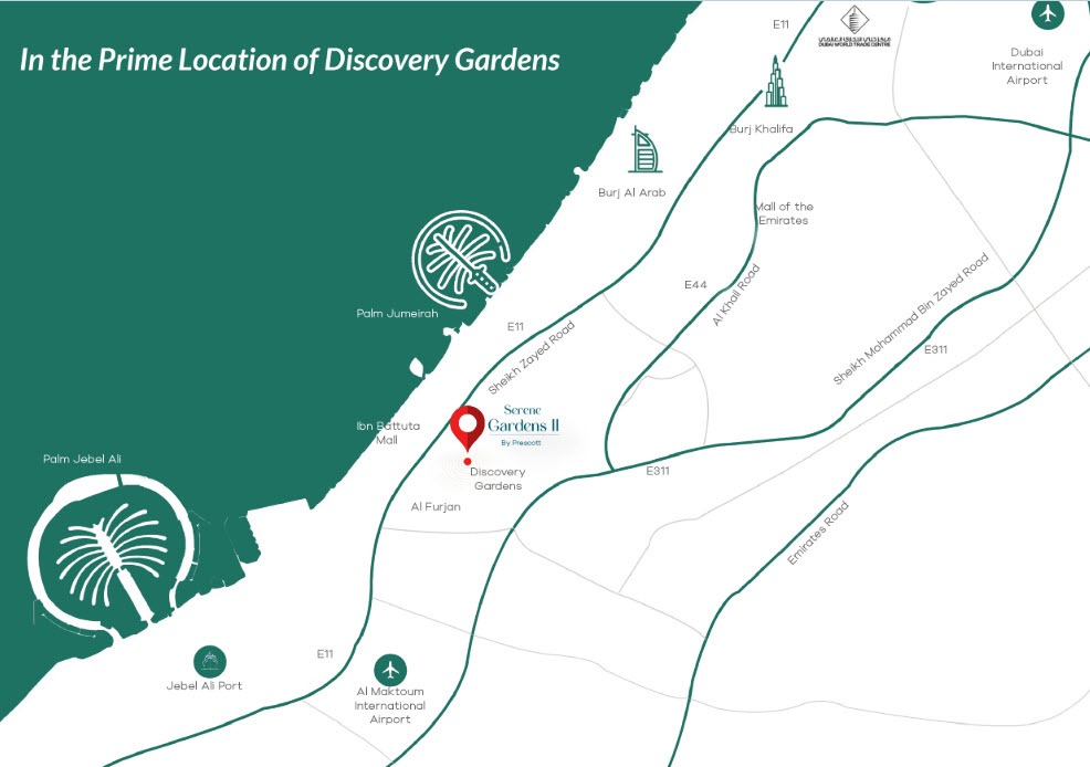 Situated in Discovery Gardens / Al Furjan, Serene Gardens II offers exceptional connectivity with close proximity to metro, shopping, and leisure destinations.