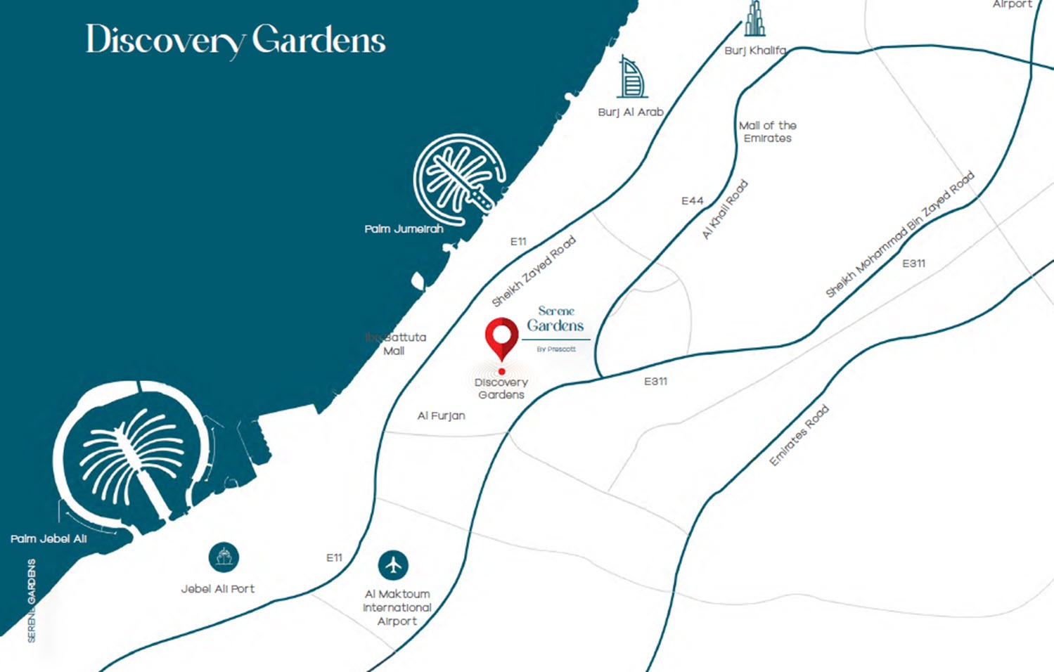 Located in the heart of Al Furjan, Serene Gardens enjoys seamless connectivity and easy access to the city’s major destinations. With its unique blend of greenery, modern amenities, and accessibility, the project presents itself as a well-rounded choice for those seeking both peace and urban convenience in Dubai.