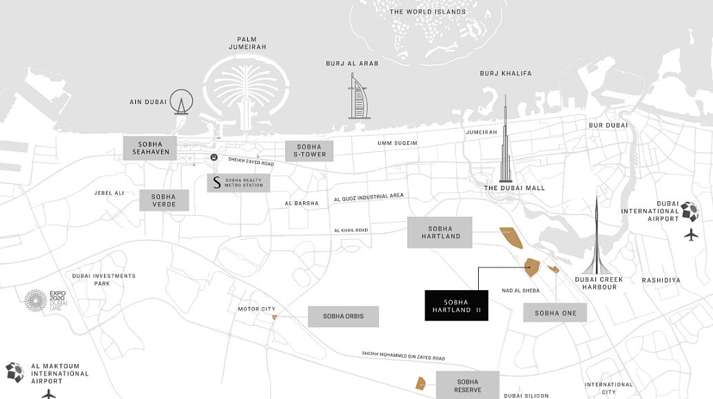 Skyscape Aura enjoys a prime location in Sobha Hartland 2, Dubai, offering residents a serene living environment with excellent urban connectivity. Surrounded by lush greenery and lagoons, the community combines peace and luxury with easy access to Dubai’s key landmarks.