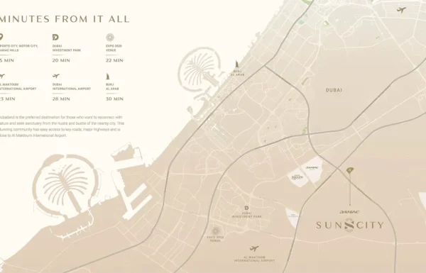 Damac Sun City enjoys a prime location in Dubailand, close to top leisure and lifestyle destinations like Damac Hills, Motor City, and Sports City. Its proximity to nature, combined with quick access to Dubai’s major roads and transit corridors, makes it an ideal base for those seeking both tranquility and connectivity.