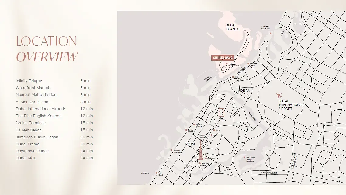Sunset Bay 2 enjoys a prime location in Dubai Islands, blending serene island living with direct access to Dubai’s cultural and commercial hubs. With 50 kilometers of coastline, private beach access, and proximity to premium retail and leisure destinations, residents can indulge in the best of both worlds—seaside tranquillity and city convenience.