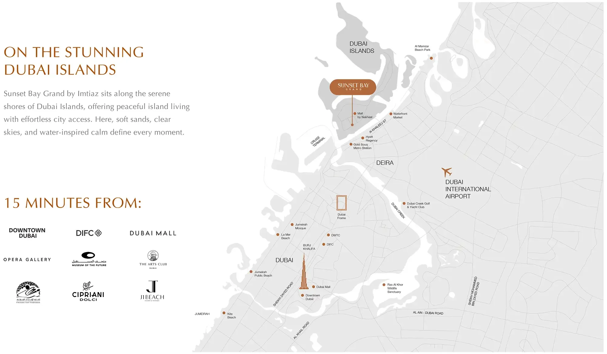 Sunset Bay Grand by Imtiaz Developments enjoys a prestigious location on Dubai Islands, offering residents the perfect fusion of island tranquility and urban connectivity. The development provides panoramic waterfront views and sits moments away from Dubai’s most sought-after attractions, cultural destinations, and leisure zones.